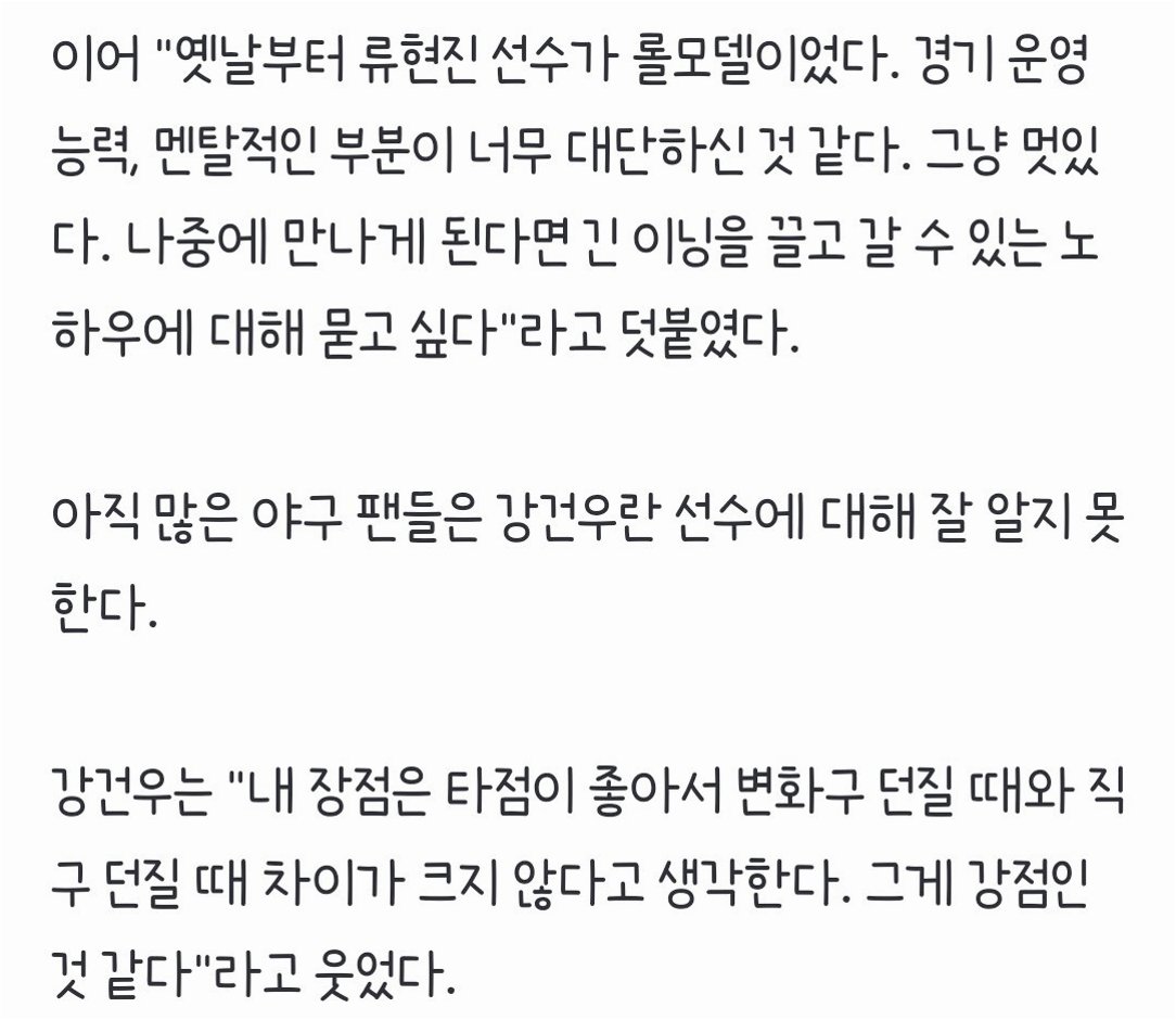 A.한화 이글스의 레전드 투수 류현진 선수입니다. 강건우 선수는 류현진 선수의 모든 것을 배우고 싶어하며, 그처럼 한화의 대표 선수로 성장하는 것을 꿈꾸고 있습니다.