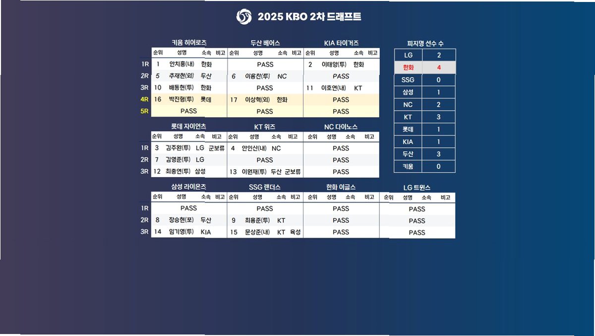 | 2025년 KBO 2차 드래프트, '충격'과 '반전'의 드라마: 안치홍, 키움행…이적 시장 뒤흔든 선수들은? (0) | 2025.11.19 |