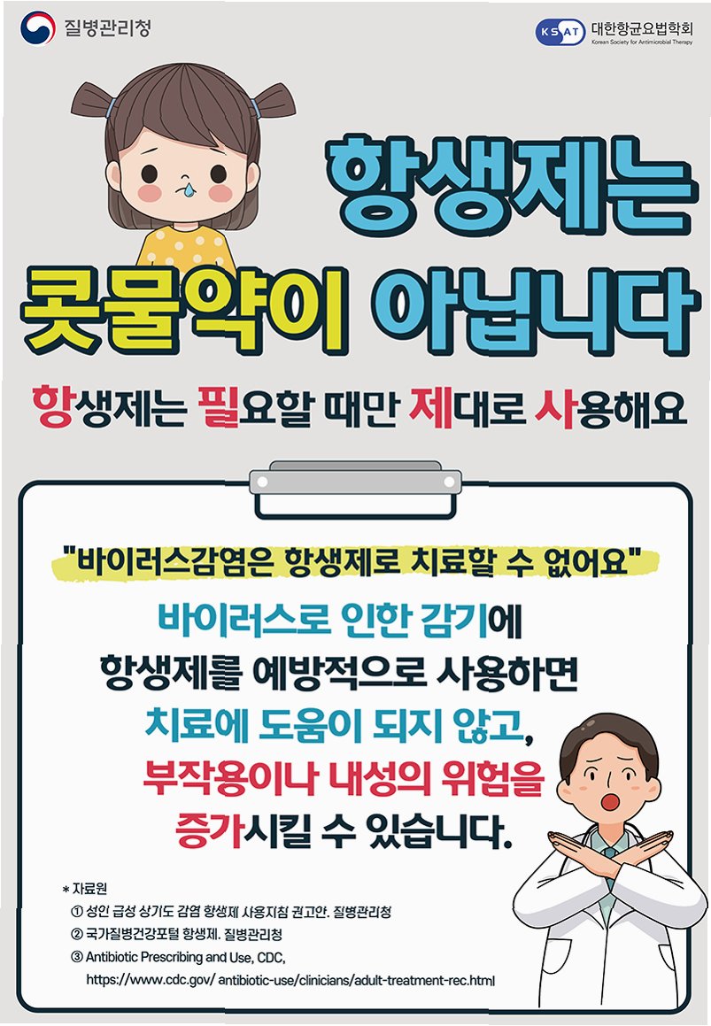 항생제 오남용은 잘못된 의학 지식에서 비롯된 측면이 큽니다. 항생제는 세균 감염에만 효과가 있으며, 감기 같은 바이러스성 감염에는 아무런 효과가 없습니다. 하지만 질병청 조사 결과, 국민 10명 중 7명(72%)이 “항생제가 감기에 도움이 된다”고 답했습니다. 심지어 의사 10명 중 2명(20.8%)도 감기처럼 항생제가 필요하지 않은 상황에서도 항생제를 처방한 것으로 나타났다.