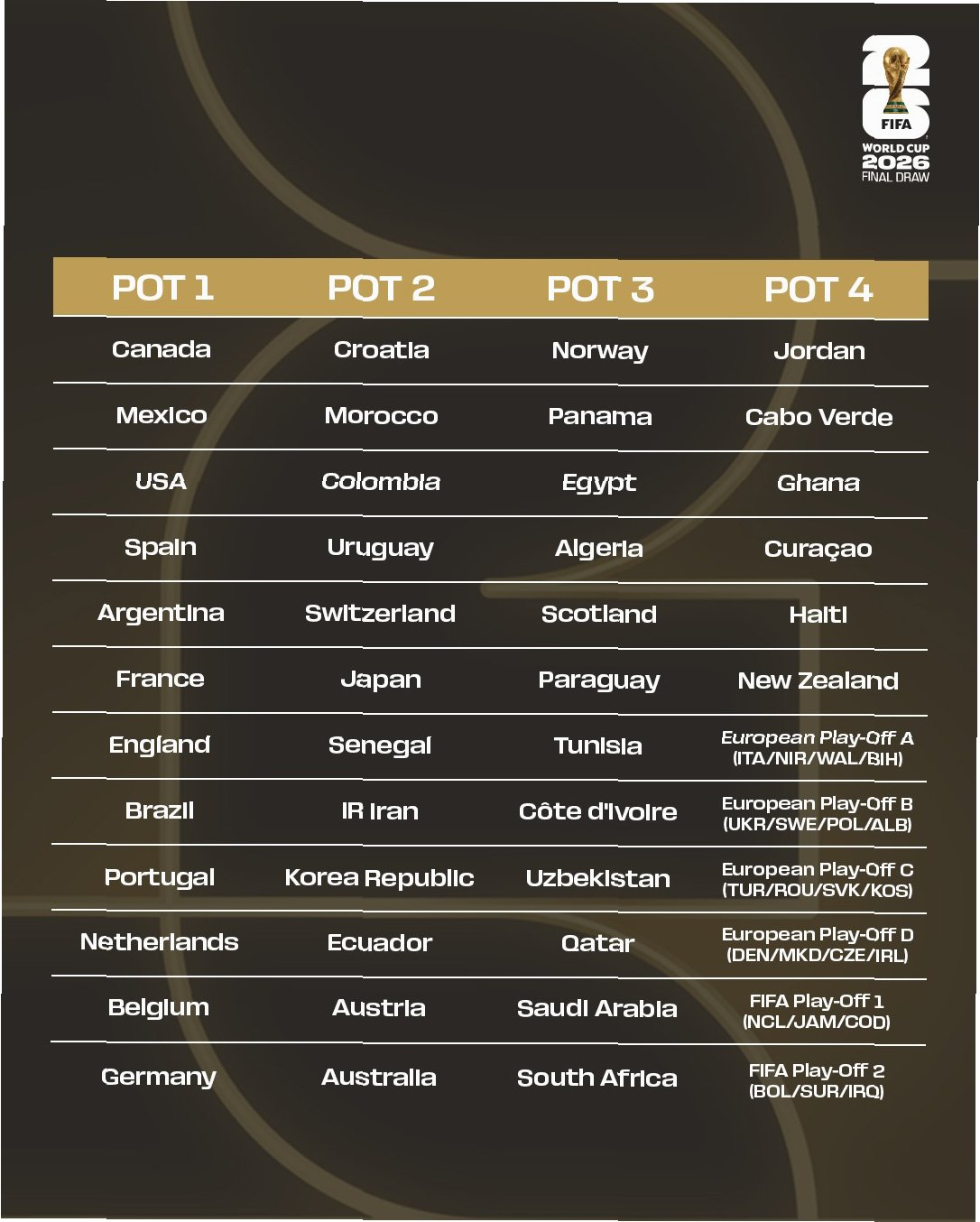 1포트에는 아르헨티나, 브라질, 프랑스 등 강력한 우승 후보들이 자리하고 있습니다. 2포트에는 대한민국을 포함하여 우루과이, 스위스, 일본 등 강팀들이 포진해 있습니다. 3포트와 4포트에는 다크호스 국가들과 유럽 및 대륙 간 플레이오프를 통해 올라오는 팀들이 자리 잡고 있습니다.
