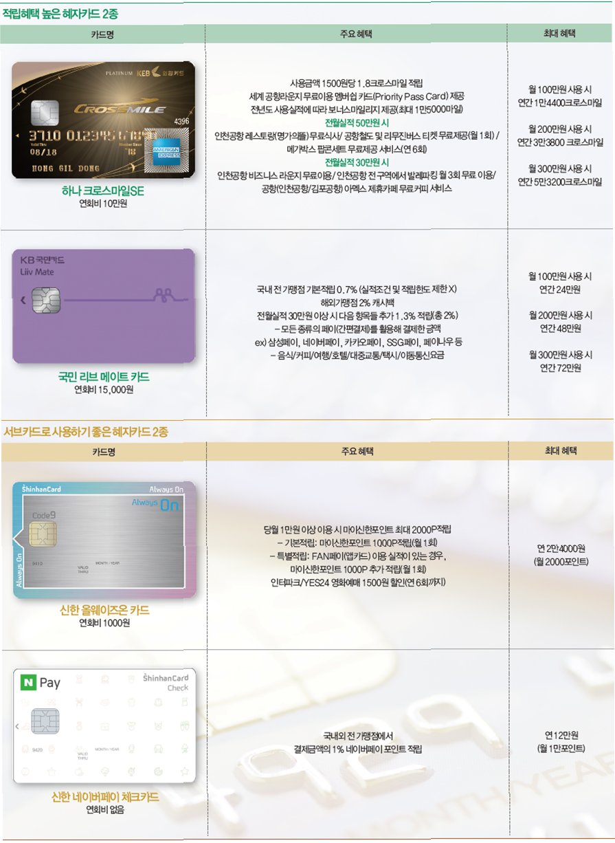 A.다양한 신용카드 정보를 비교해보고, 본인의 소비 패턴에 맞는 카드를 찾는 것이 좋습니다. 금융 상품 비교 사이트나 카드사 홈페이지를 참고해보세요.