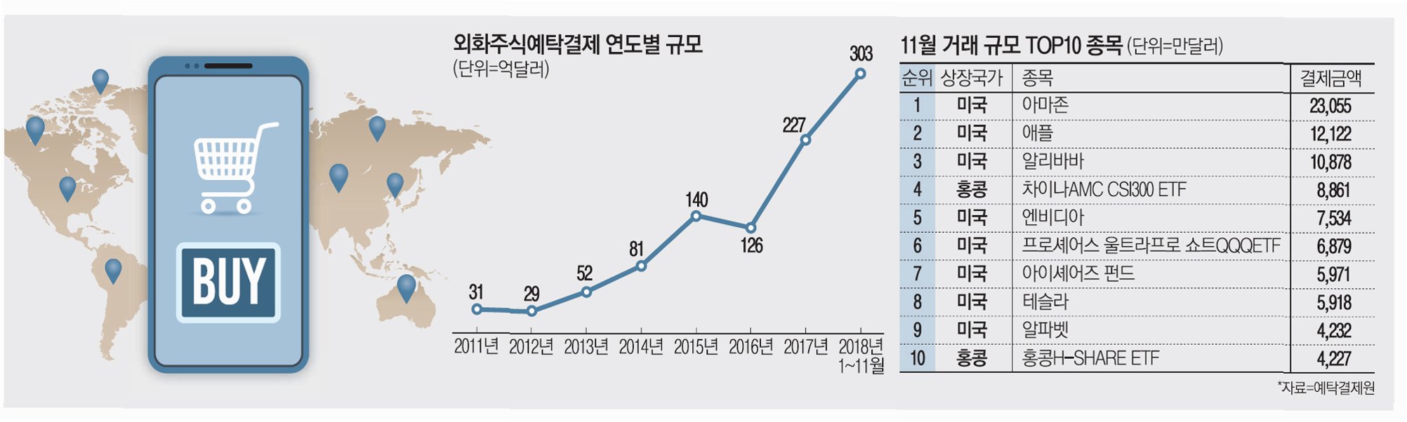 다만 최근 두 달간 개인투자자의 해외주식 투자 ‘쏠림’이 유독 뚜렷해진 것도 사실이다. 한국예탁결제원에 따르면 개인투자자는 10~11월에만 123억3700만 달러에 달하는 해외주식을 순매수한 것으로 집계됐다. 10월 68억1300만 달러로 역대 최대를 기록한 데 이어 11월(1~28일)에도 55억2400만 달러로 매수세가 크게 꺾이지 않았다.
