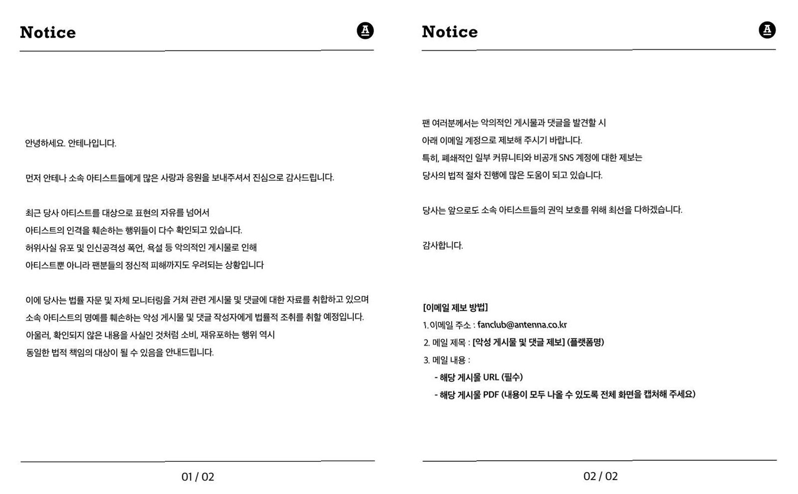 A.아티스트를 대상으로 한 허위 사실 유포, 인신공격성 폭언, 욕설 등 악의적인 게시물로 인해 아티스트와 팬들이 정신적 피해를 입고 있기 때문입니다.