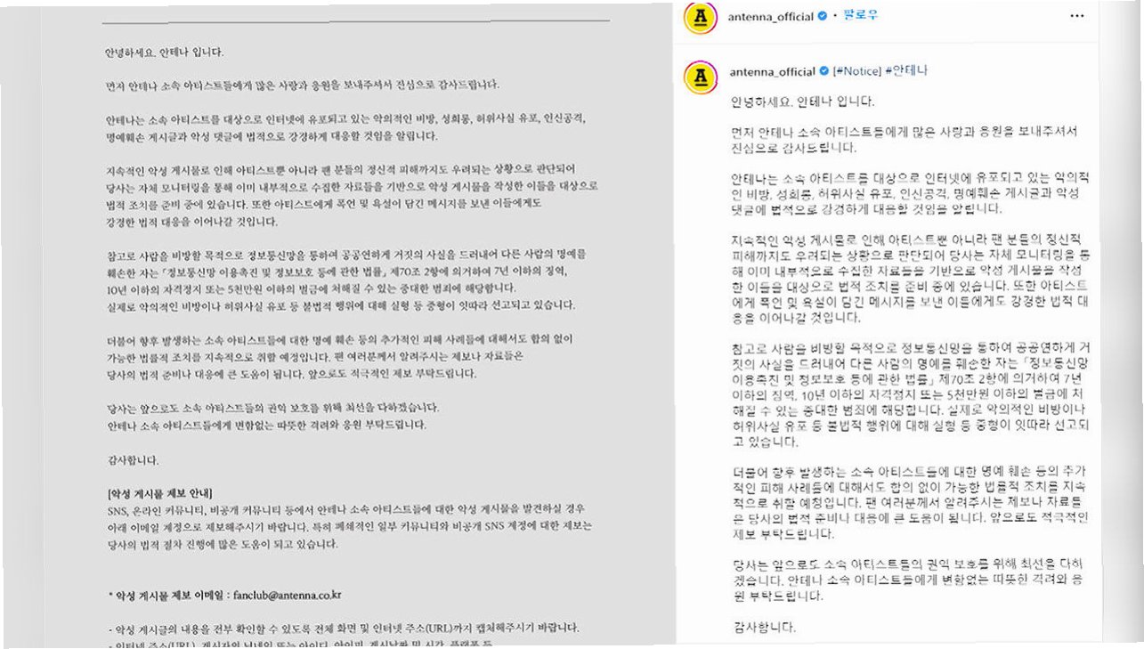 안테나는 공식 입장을 통해 허위 사실 유포, 인신공격성 폭언, 욕설 등 악의적인 게시물로 인해 아티스트뿐만 아니라 팬들까지 정신적 피해를 입고 있다고 밝혔습니다. 이러한 상황에 대한 심각성을 인지하고, 법률 자문 및 자체 모니터링을 통해 관련 자료를 수집해 왔습니다. 소속 아티스트의 명예를 훼손하는 행위에 대해서는 강력하게 법적 책임을 묻겠다는 의지를 분명히 했습니다.