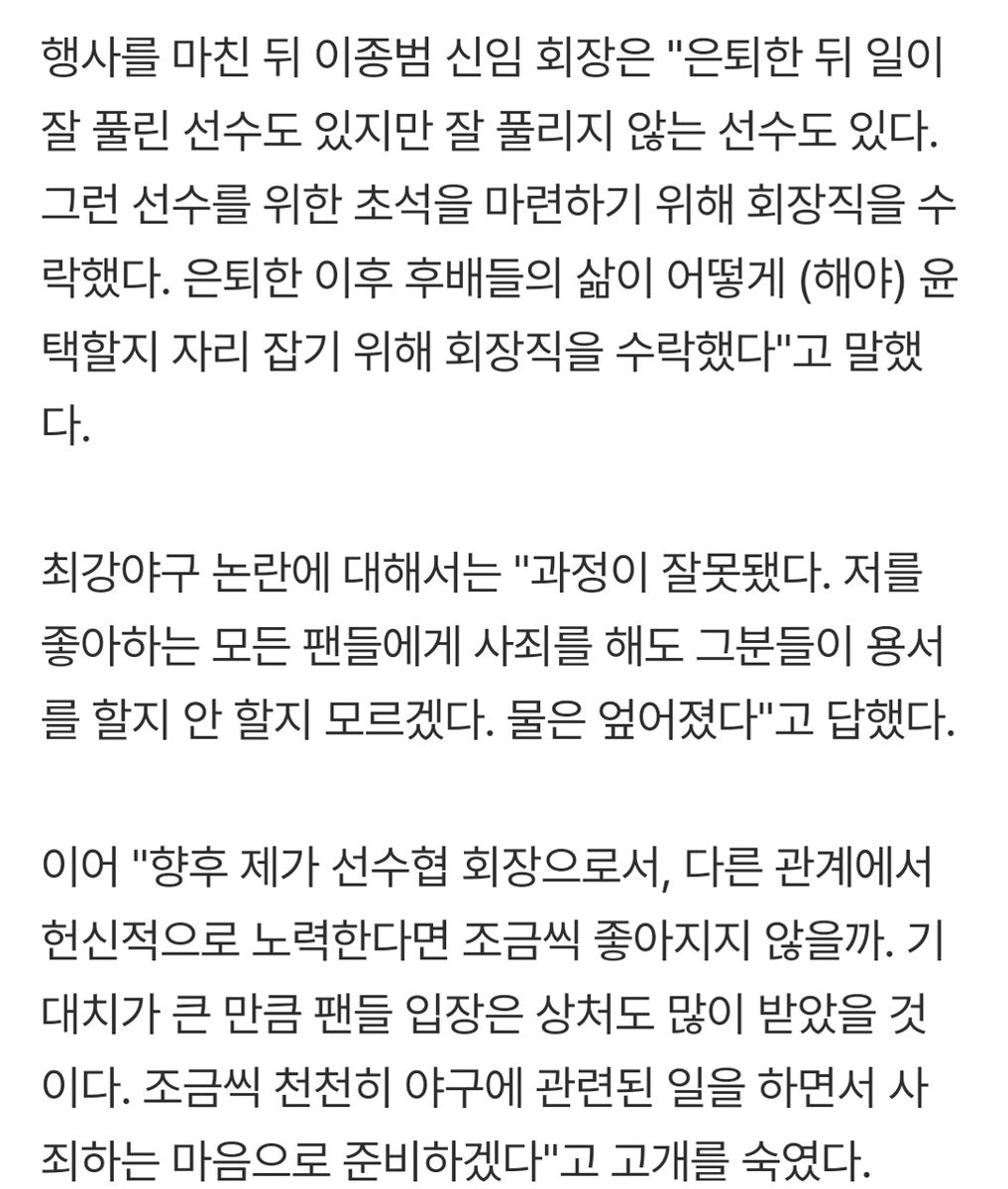 이종범 선수는 KT 퇴단에 대한 사과와 함께, 야구계에 헌신하겠다는 의지를 밝혔습니다. 그는 한은회 회장으로서 은퇴선수들의 권익 보호와 야구 발전을 위해 노력하며, 일구회와의 관계 개선을 통해 야구계의 화합을 이끌어갈 것입니다. 그의 새로운 시작이 한국 야구에 긍정적인 영향을 가져다주기를 기대합니다.