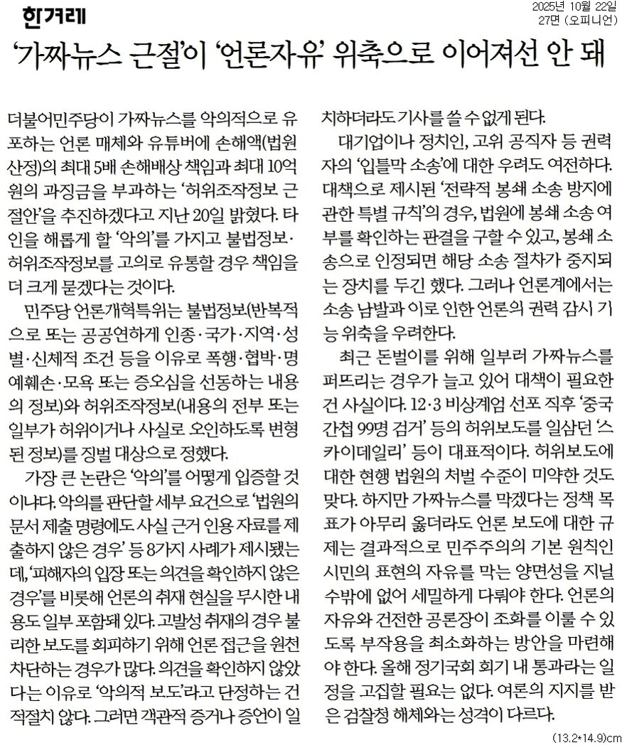 가짜뉴스 근절을 위한 ‘허위조작정보 근절법’ 통과, 언론의 비판 위축 우려와 표현의 자유 침해 논란, 징벌적 손해배상과 가짜뉴스 정의의 모호성, 언론 자유와 사회적 책임 사이의 균형점 모색 필요.