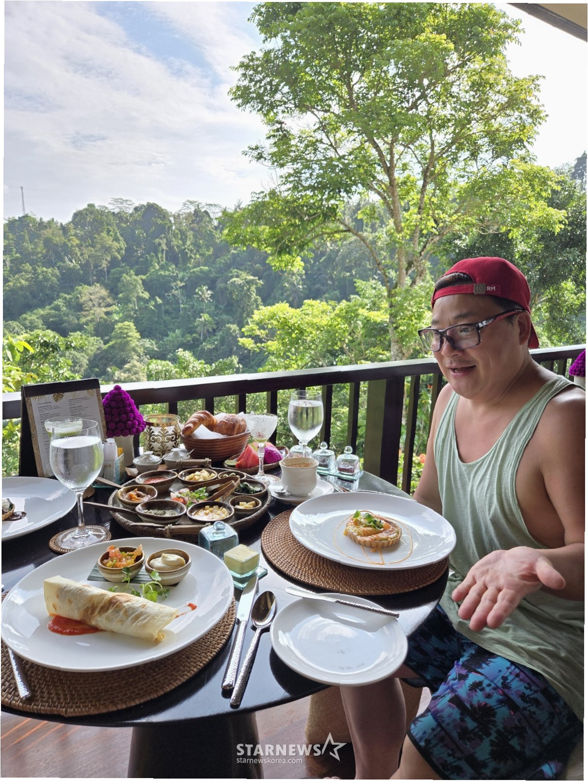 코미디언 윤정수가 인도네시아 발리 우붓에서 신혼여행의 낭만을 만끽하는 모습이 포착되었습니다. 스타뉴스는 17일, 우붓에서 촬영된 윤정수의 신혼여행 사진을 단독 입수했는데요. 공개된 사진 속 윤정수는 울창한 밀림을 배경으로 조식을 즐기며 여유로운 아침을 맞이하고 있었습니다. 빵과 음료, 다채로운 요리로 가득한 푸짐한 한 상이 보는 이들의 식욕을 자극하며, 행복한 미소를 짓는 윤정수의 모습은 신혼여행의 설렘을 고스란히 전달했습니다.