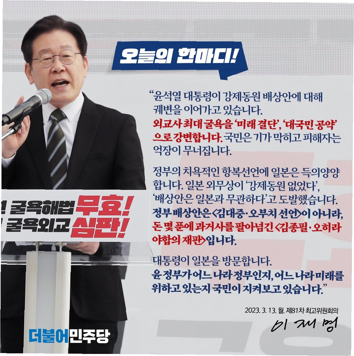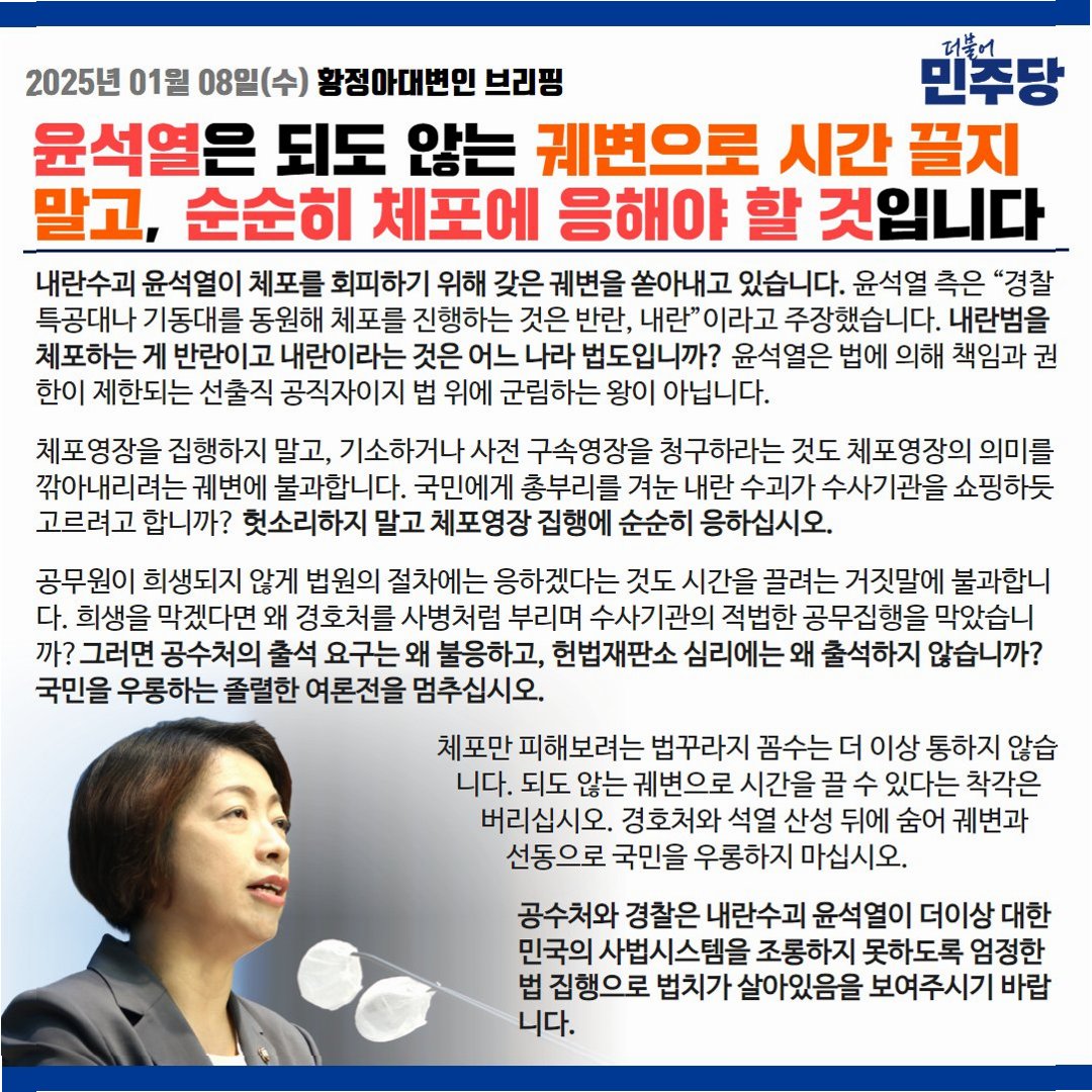 더불어민주당은 윤석열 전 대통령이 특수공무집행방해 등의 사건에 대한 결심 공판에서 비상계엄 선포 당위성을 주장한 것에 대해 강하게 비판하며, 그의 행위를 '내란 책임을 부정한 국민 배신'으로 규정했습니다. 백승아 원내대변인은 최후진술에서조차 불법계엄을 '계몽령, 경고용'이라는 궤변을 반복한 윤 전 대통령을 '국민과 헌법, 민주주의를 능멸하고 모욕한 파렴치한 태도'라고 강력히 비난했습니다. 민주당은 사법부의 엄중한 처벌을 촉구하며, 무너진 민주주의와 헌정질서를 회복하기 위한 사법적 심판의 중요성을 강조했습니다.