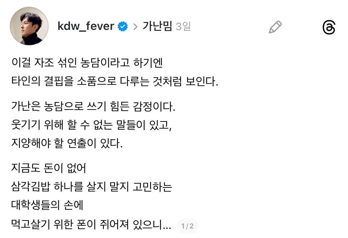최근 소셜 미디어(SNS)를 중심으로 일명 '가난 밈(meme)'이 유행처럼 번지고 있습니다. 이는 가난한 현실을 유머 소재로 삼아, 때로는 과장된 방식으로 표현하는 경향을 보입니다. 이러한 흐름에 대해 가수 겸 배우 김동완 씨가 자신의 SNS를 통해 날카로운 비판을 제기했습니다. 그는 타인의 결핍을 소품으로 삼는 듯한 행태에 대해 불편함을 드러내며, 가난은 농담으로 치부하기 어려운 감정이라고 강조했습니다.