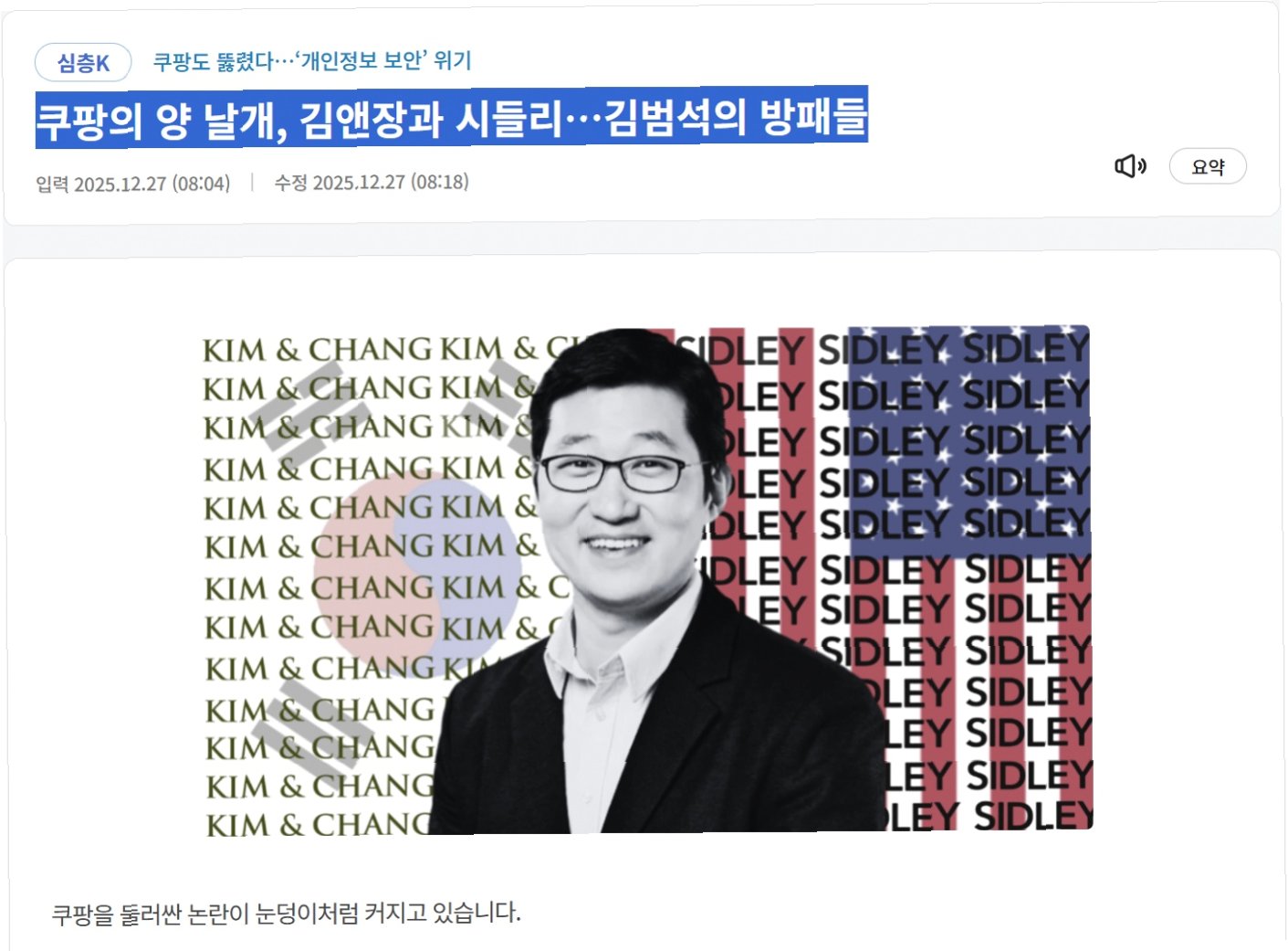 쿠팡 사태가 법리 싸움으로 번질수록 김앤장과 시들리 출신 인사들의 목소리도 커질 수밖에 없습니다. 문제는 이들이 사태를 풀기보다는 ‘기업의 책임을 최소화하는 전략’에만 몰두하고 있다는 점입니다. 쿠팡의 관리 부실을 인정하는 순간, 곧바로 거액의 손해배상 책임으로 이어지기 때문에 모든 판단이 ‘리스크 관리’의 틀 안에서만 이뤄지고 있습니다. 그 결과 피해자 구제나 재발 방지 대책은 한 발짝도 나아가지 못한 채 법률적 방어막에 부딪혀 되돌아옵니다. 김범석 의장은 자신이 결정해야 할 순간에도 법률가들의 조언에만 기대는 건 아닐까. 언제까지 법률가들이 설계한 ‘가장 안전한 조언’ 뒤에 숨어 있을지…. 쿠팡과 김범석 의장의 제1 목적은 '사업을 하는 것'입니까? '위험을 피하는 것'입니까? 한국 소비자들은 묻고 있습니다.