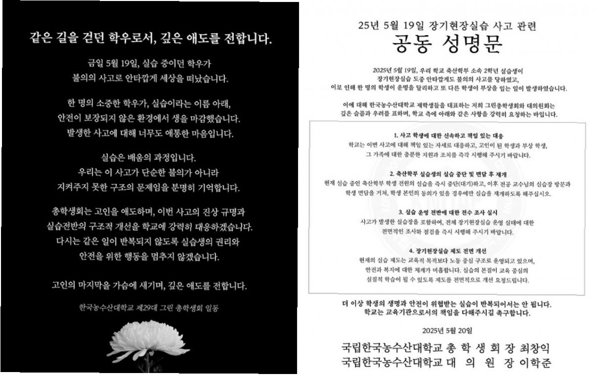 한농대 2학년 학생들은 두 학기 동안 외부에서 장기 현장실습을 받아야 합니다. 이는 학교 교육의 일환으로 진행되지만, 실질적으로는 노동에 가까운 형태로 운영되고 있습니다. 학생들은 최저임금도 받지 못한 채 위험한 환경에서 장시간 노동에 시달리고 있으며, 안전 교육 및 보호 장비 또한 제대로 제공받지 못하는 경우가 많습니다. 이러한 장기 현장실습의 문제점은 교육의 본질을 훼손하고, 학생들의 안전을 위협하는 주요 원인으로 작용하고 있습니다. 한농대 총학생회는 “실습제도는 교육 목적보다 노동 중심 구조로 운영되고 있으며, 안전과 복지에 대한 체계가 미흡하다”고 지적하며, 실습 제도의 전면적인 개선을 촉구했습니다.