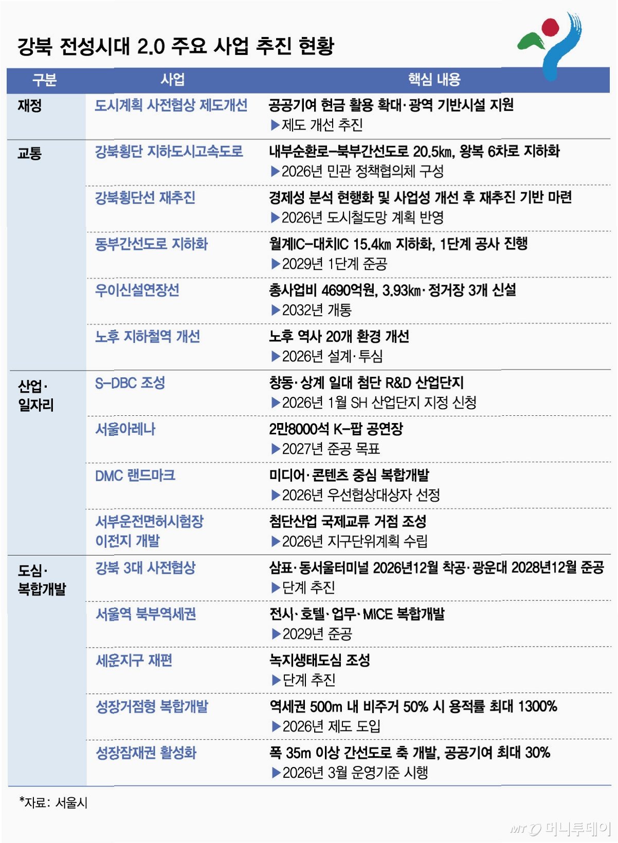 서울시는 16조 원을 투입해 강북 지역의 교통망을 혁신하고 미래 산업 거점을 조성하는 '강북전성시대 2.0'을 발표했습니다. 서울역 북부역세권, 동서울터미널 개발과 함께 새로운 도시개발 모델 도입으로 지역 경제 활성화와 일자리 창출을 도모하며, 강북을 서울의 새로운 성장축으로 육성하여 도시 경쟁력을 한층 높일 계획입니다.
