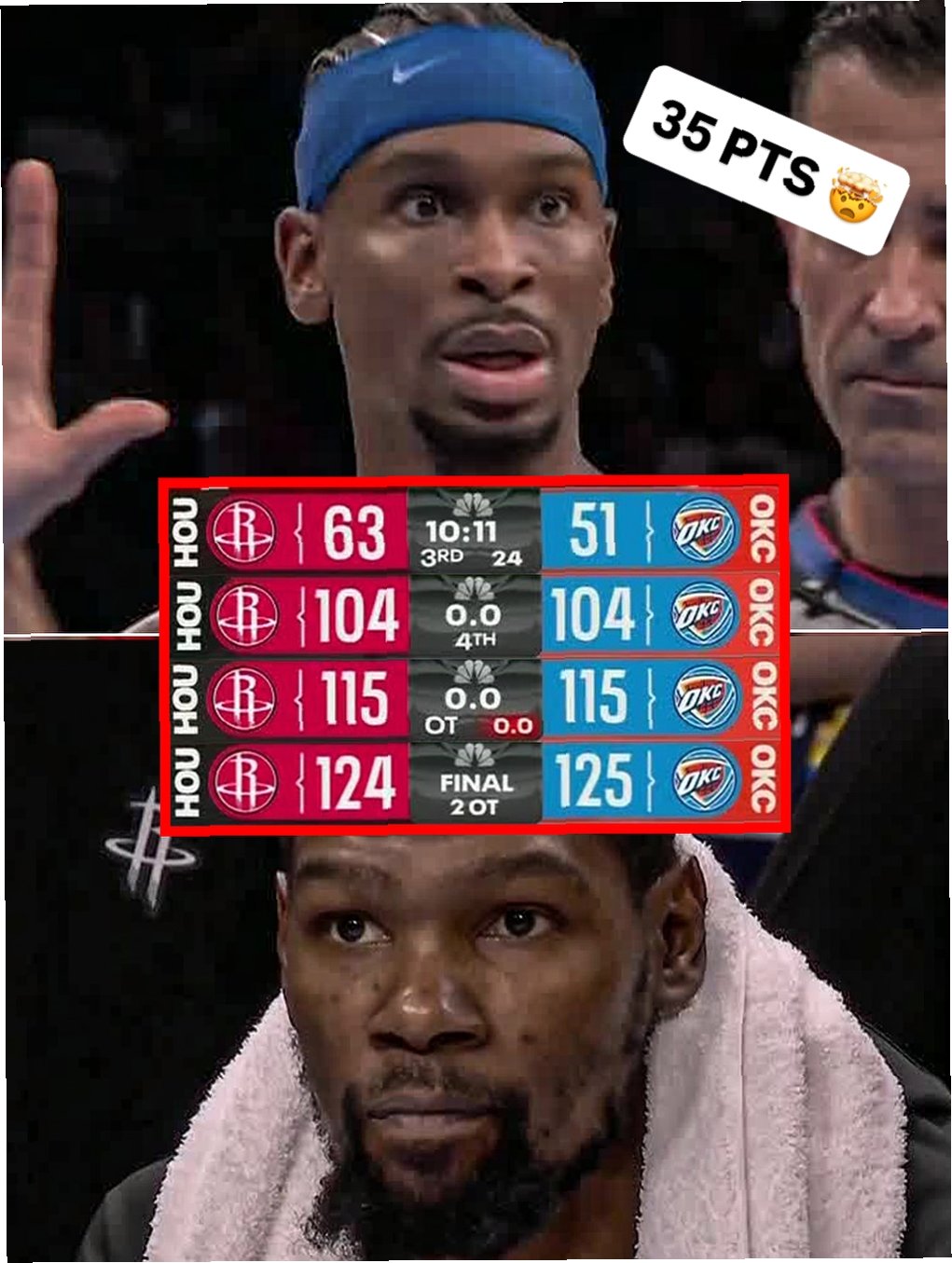 A.SGA는 35점 5리바운드 5어시스트를 기록하며 팀 승리를 이끌었습니다. 특히 4쿼터와 2차 연장에서 클러치 득점을 성공시키며 승리의 주역이 되었습니다.