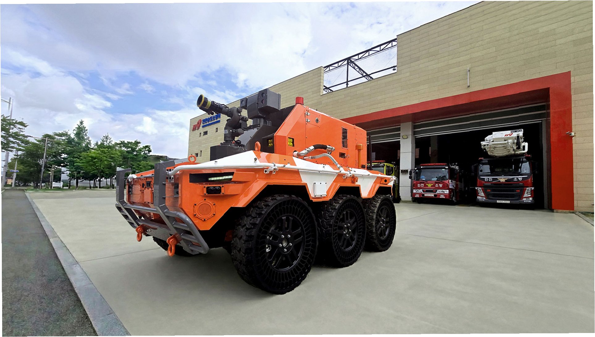 영상 속 무인소방로봇은 △첨단 자율주행 보조 시스템 △AI 시야 개선 카메라 △고압 축광 릴호스 △6X6 인휠모터 시스템 등 최첨단 기술을 탑재하고 있습니다. 이러한 기능들은 로봇이 복잡하고 위험한 현장을 스스로 인지하고, 최적의 경로로 이동하며, 효과적으로 화재를 진압할 수 있도록 지원합니다. 특히 AI 시야 개선 카메라는 짙은 연기 속에서도 정확한 상황 판단을 돕고, 원격 조정을 통해 현장 식별 및 화점 접근, 직접적인 화재 진압까지 가능하게 설계되었습니다.