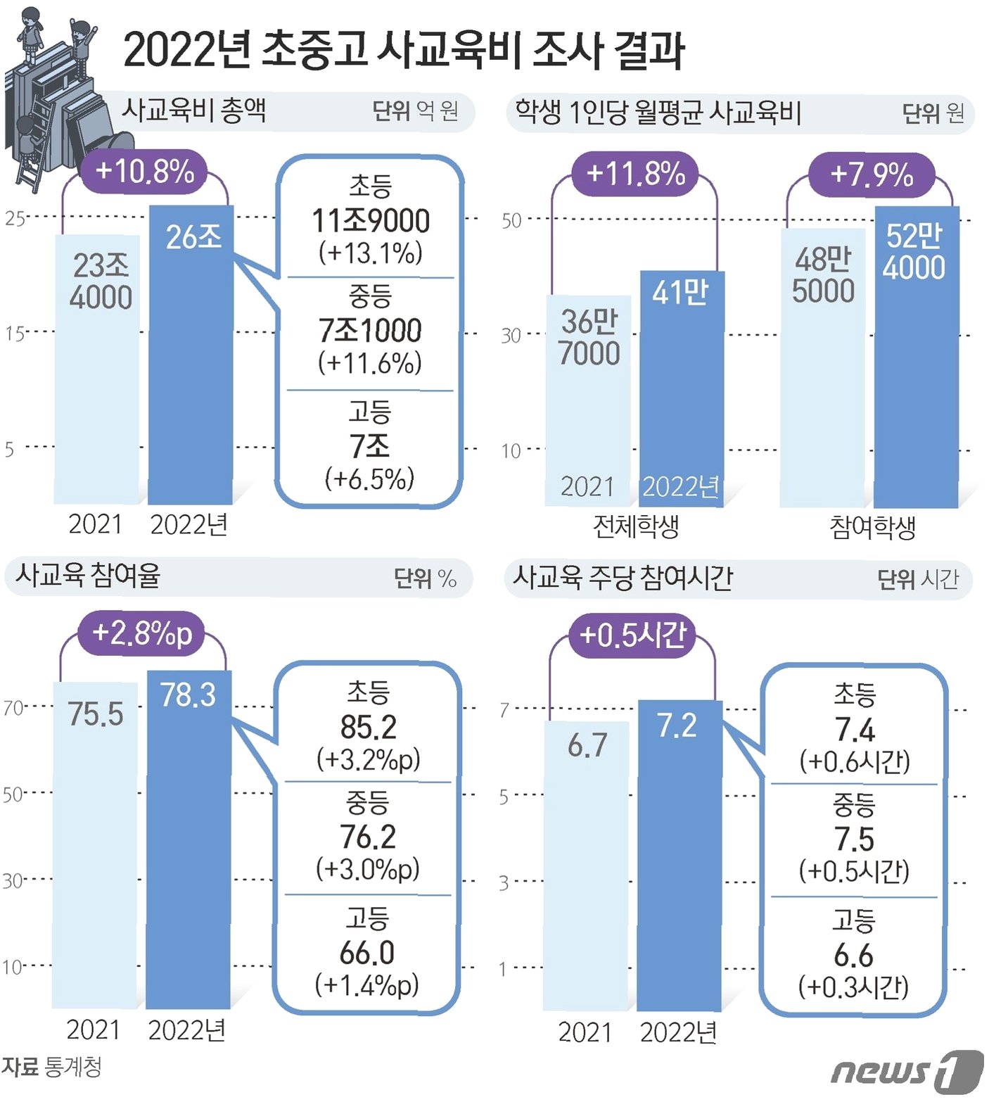 우리 아이들의 미래를 위한 투자, 바로 사교육입니다. 최근 발표된 조사 결과에 따르면, 초등학생 10명 중 8명 이상, 무려 84.4%가 사교육에 참여하고 있다는 충격적인 사실이 드러났습니다. 이는 학교급 중 가장 높은 참여율로, 우리 아이들이 학업 스트레스 속에서도 끊임없이 배우고 성장하려는 열정을 보여주는 증거일지도 모릅니다. 하지만 이 열정 뒤에는 상당한 경제적 부담이 따릅니다. 사교육에 참여하는 초등학생 1명의 월평균 지출액은 51만 2천원에 달합니다. 이는 단순한 교육비 이상의 의미를 가지며, 많은 가정에 경제적 고민을 안겨주고 있습니다.