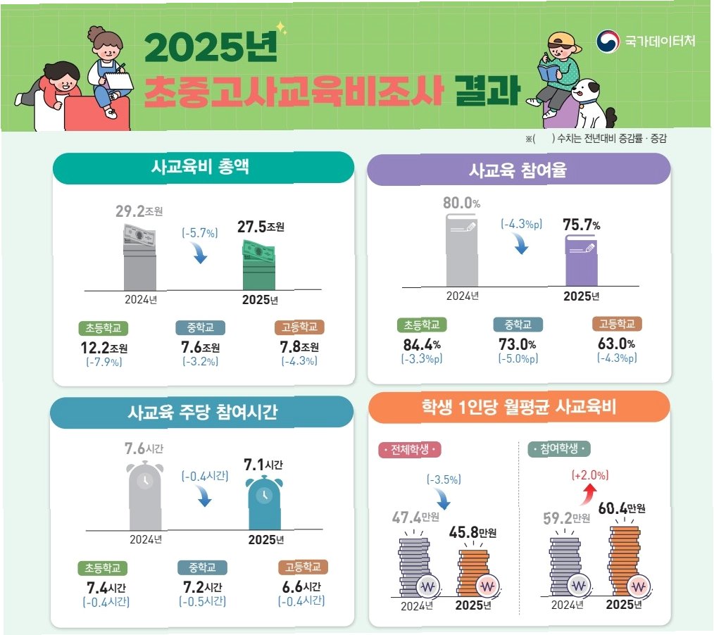 국가데이터처의 2025년 초중고 사교육비 조사 결과, 지난해 사교육비 총액은 27조 5천억원으로 집계되었습니다. 이는 전년 대비 1조 7천억원 감소한 수치로, 5.7% 줄어든 것입니다. 언뜻 보면 사교육비 부담이 줄어드는 긍정적인 신호처럼 보일 수 있습니다. 하지만 전체 학생 기준 사교육 참여율은 75.7%로 전년보다 4.3%p 낮아졌으며, 학교급별 평균 사교육비 역시 초등학교 43만 3천원, 중학교 47만 5천원, 고등학교 49만 1천원으로 감소했습니다. 이러한 수치들은 사교육 참여율 감소와 함께 전반적인 지출 감소를 보여주지만, 실제 사교육에 참여하는 학생들의 부담은 여전히 크다는 점을 간과해서는 안 됩니다.