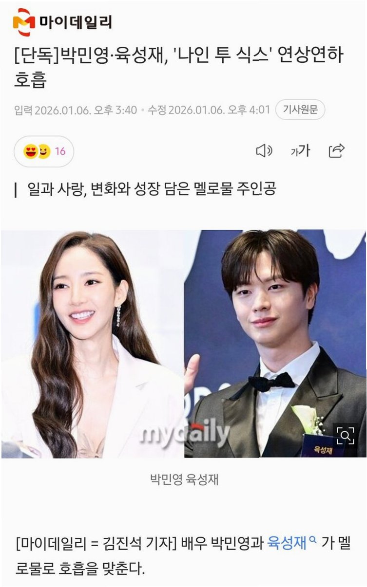 가수 겸 배우 육성재가 SBS 새 드라마 '나인 투 식스'에서 9살 연상 박민영과 호흡을 맞춥니다. 육성재는 인턴 한선우 역으로, 박민영은 법무팀 차장 강이지 역을 맡아 현실 공감 오피스 로맨스를 선보일 예정입니다. 연기력을 인정받은 육성재와 로맨스 퀸 박민영의 만남이 어떤 시너지를 낼지 기대가 모아지며, 드라마는 2026년 하반기 방영됩니다.
