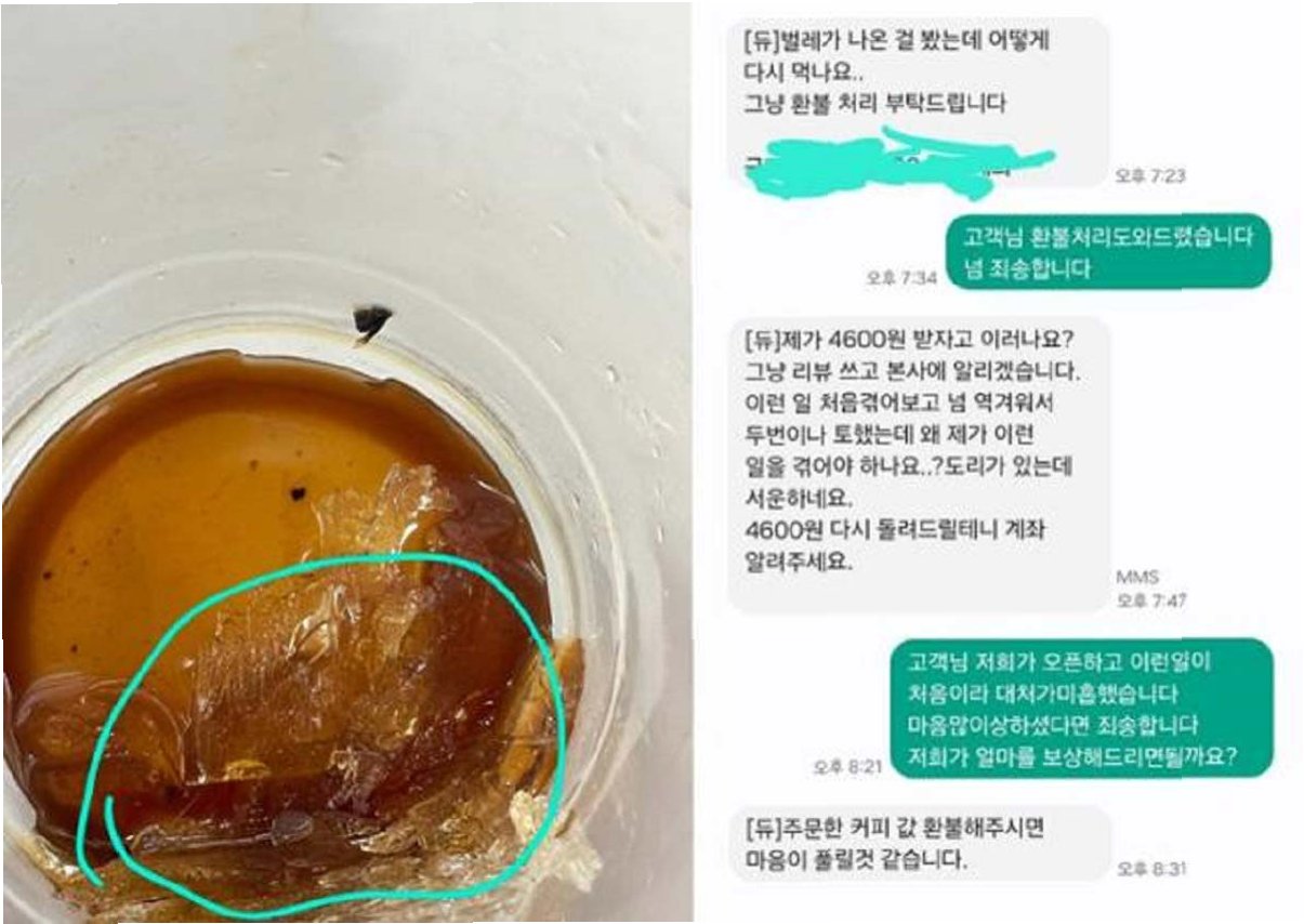 A씨는 환불을 거절당하자 낮은 목소리로 환불을 요청했으나, 매장 사장으로 보이는 여성은 A씨를 '진상'으로 취급하며 직원에게 환불을 지시했습니다. A씨는 시간적 손해와 불쾌한 경험으로 인해 같은 음료를 다시 마시고 싶지 않았음에도 불구하고, 환불 과정에서 모욕감을 느껴 주말 오후의 기분을 망쳤다고 밝혔습니다. 이는 명백한 이물질 혼입 사고임에도 불구하고, 고객의 정당한 요구가 무시되고 오히려 불쾌한 경험을 겪게 된 사례로 많은 이들의 공분을 사고 있습니다.