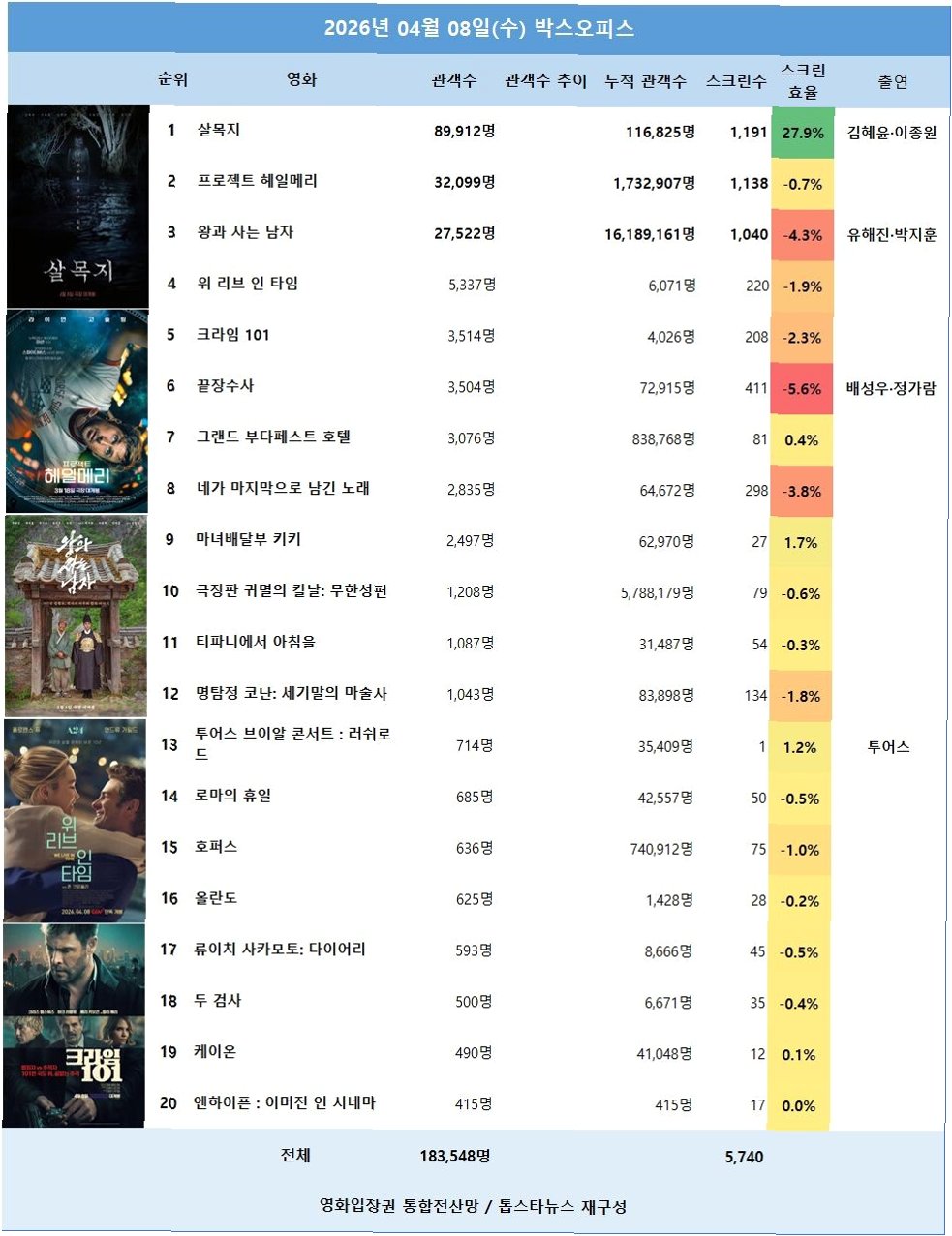 박스오피스 순위 변동, '살목지'의 등장으로 경쟁작들 긴장