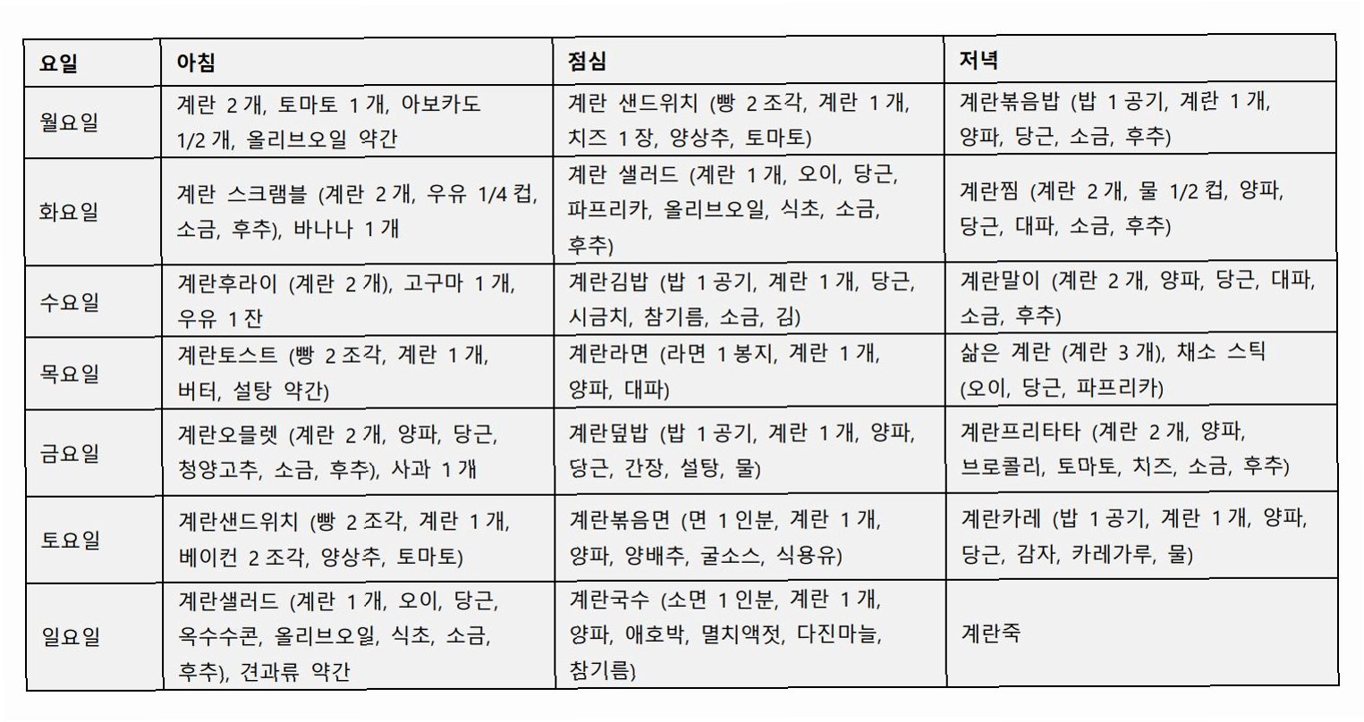 A.계란은 훌륭한 단백질 공급원이지만, 탄수화물, 지방, 비타민, 미네랄 등 다른 영양소도 균형 있게 섭취해야 합니다. 계란과 함께 채소, 통곡물 등을 곁들여 드시는 것이 좋습니다.