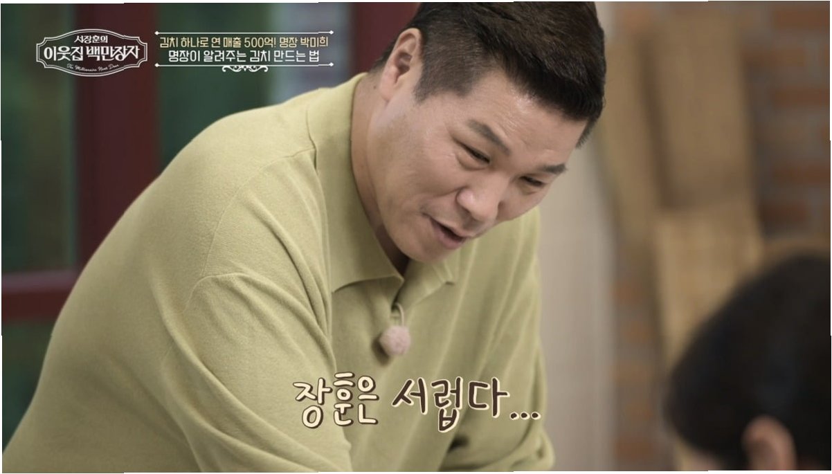 EBS '서장훈의 이웃집 백만장자'에서 박미희 명장은 차원이 다른 김치 비법을 직접 전수합니다. 서장훈과 장예원은 명장의 손맛을 따라 하려 고군분투하지만, 쉽지 않은 듯합니다. 특히 서장훈은 앞치마와 요리용 장갑까지 착용하며 열정을 불태웠지만, 박미희 명장으로부터 칭찬 대신 '김치야 떡이야!'라는 폭풍 잔소리를 들어야 했습니다.