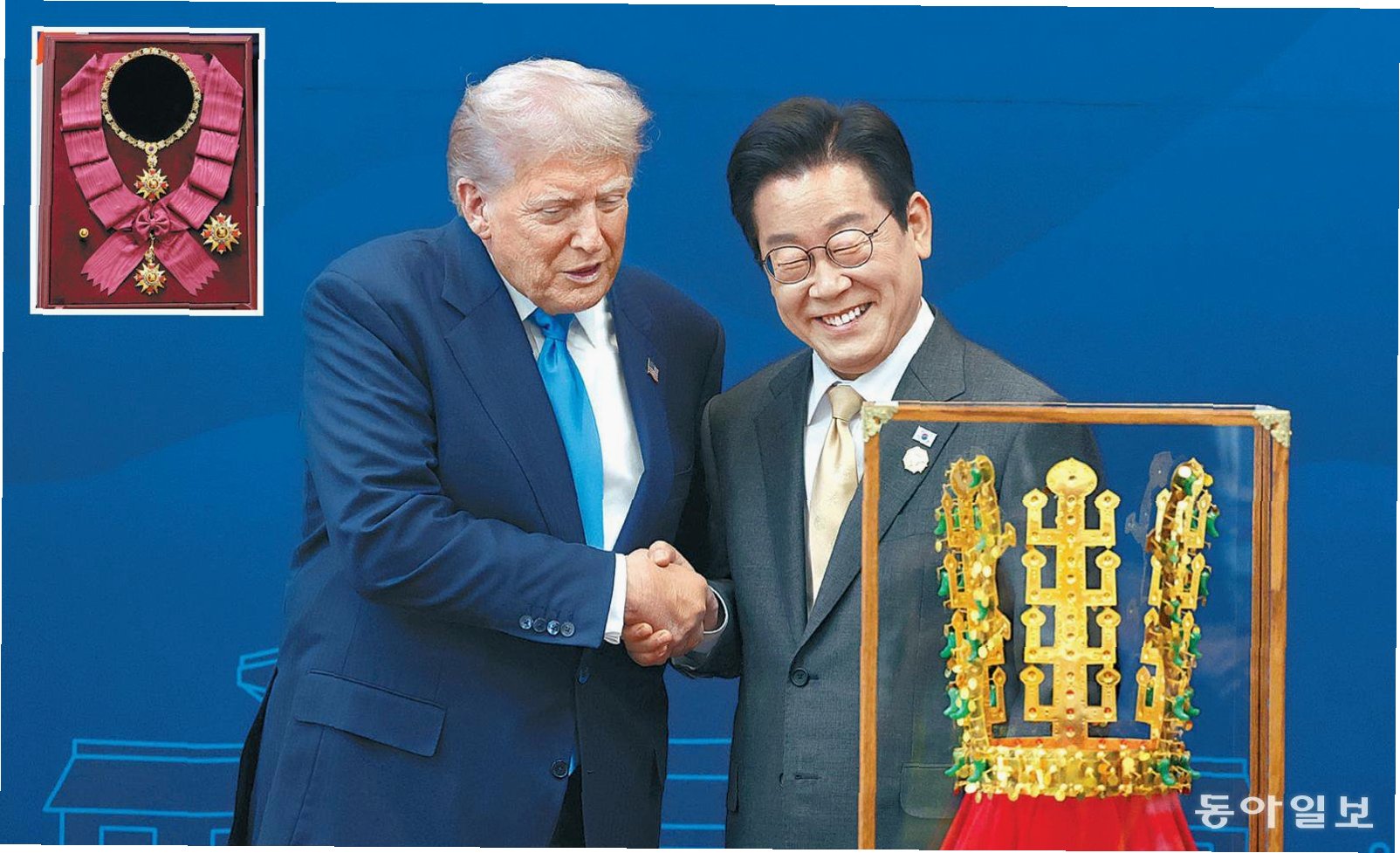 이재명 대통령은 정상회담에서 트럼프 전 대통령에게 무궁화 대훈장과 천마총 금관 모형을 선물했습니다. 트럼프 전 대통령은 금관 모형을 받자 “특별히 잘 챙기라”고 지시했으며, 무궁화 대훈장을 보고선 “당장 걸고 싶다”고 말하는 등 흡족한 반응을 보였습니다.