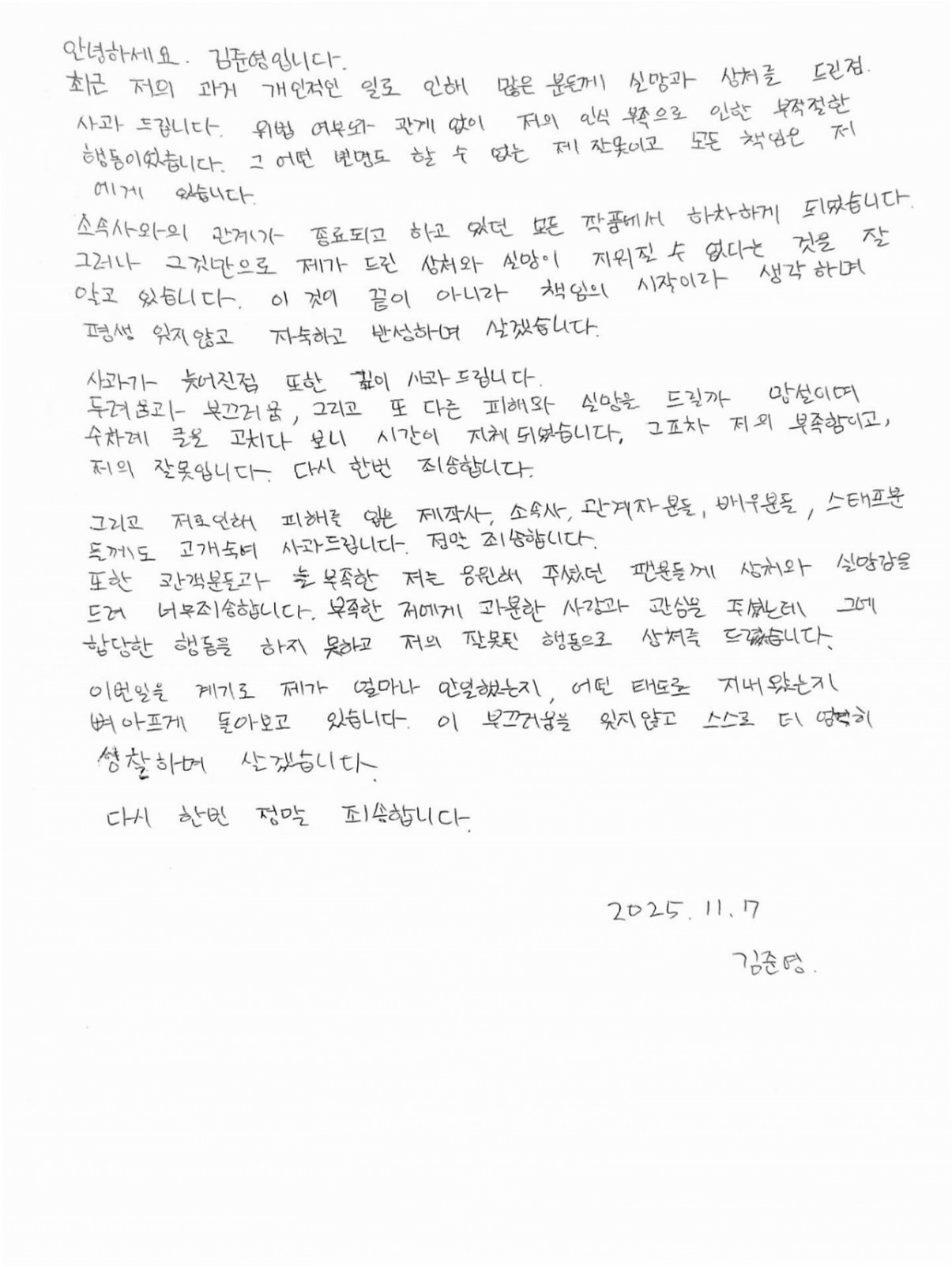 김준영, 유흥업소 출입 인정과 자필 사과문 발표
