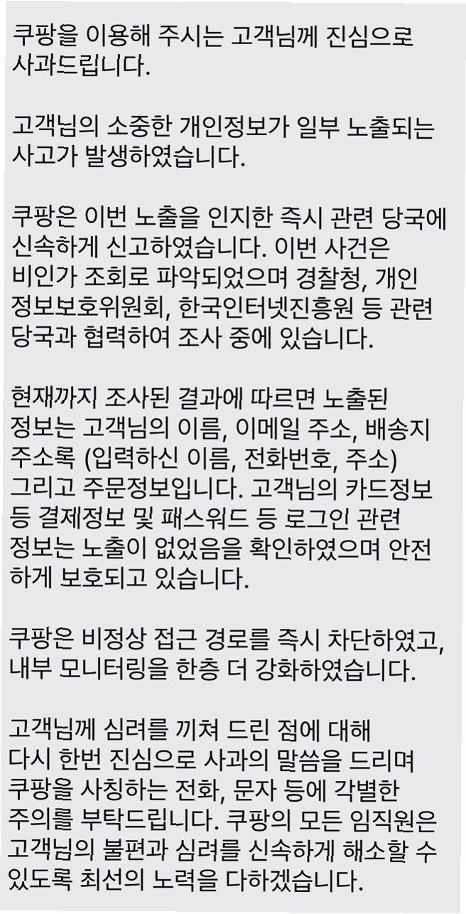 쿠팡이 공식 발표를 통해 3,370만 개의 고객 계정에서 개인정보가 유출되었음을 밝혔습니다. 이는 쿠팡이 처음 발표했던 내용보다 훨씬 심각한 규모로, 사실상 쿠팡 고객 대부분의 개인정보가 외부로 노출된 셈입니다. 이번 사고는 온라인 쇼핑을 즐겨 하는 많은 사람들에게 큰 불안감을 안겨주고 있습니다.