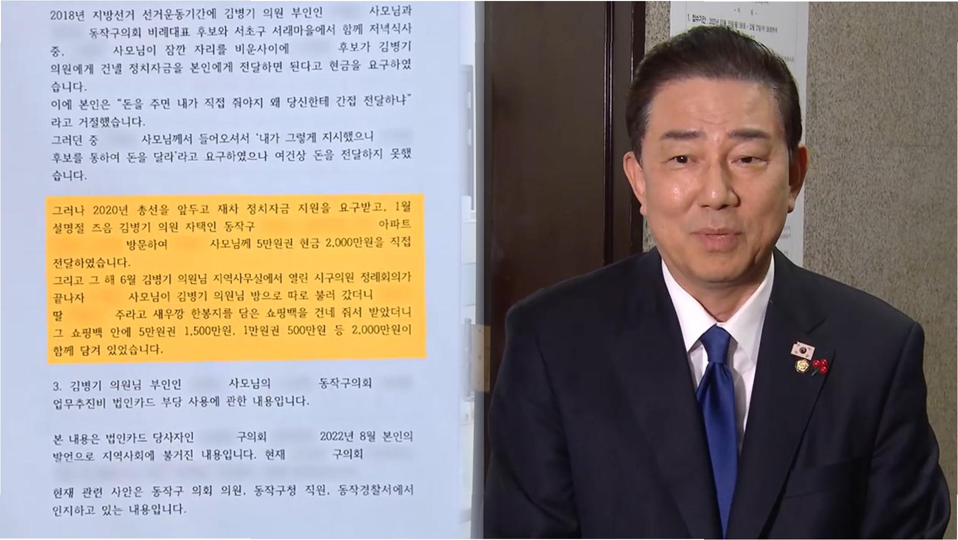더불어민주당 김병기 의원 배우자 이모씨의 동작구의회 업무추진비 횡령 의혹과 관련해 김 의원의 전직 보좌관이 사건 해결에 관여했다는 진술이 추가로 확인됐다. 김 의원이 경찰 내사 당시 여당인 국민의힘 '친윤' 의원에게 수사 무마를 청탁했다는 취지의 진술에 이어 추가로 수사 무마 정황이 진술로 나온 것이다.
