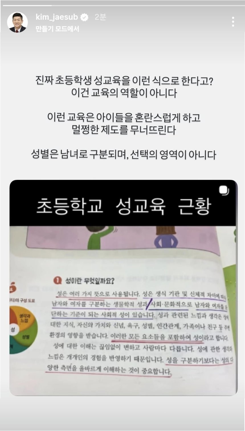 최근 초등학교 성교육 교재를 둘러싸고 사회 각계에서 뜨거운 갑론을박이 벌어지고 있습니다. 국민의힘 김재섭 의원은 자신의 SNS를 통해 '초등학교 성교육 근황'이라는 제목의 게시물을 공유하며, 해당 교재의 내용에 대해 강한 우려를 표했습니다. 그는 '진짜 초등학생 성교육을 이런 식으로 한다고?'라며 놀라움을 금치 못했습니다. 이 교재는 성을 생물학적 성과 사회적 성으로 구분하며, 성에 대한 느낌과 생각이 다양한 요소의 영향을 받는다고 설명하고 있습니다. 하지만 김 의원은 이러한 교육이 아이들을 혼란스럽게 하고 제도를 무너뜨릴 수 있다고 지적하며, '성별은 남녀로 구분되며 선택의 영역이 아니다'라고 단호하게 말했습니다.