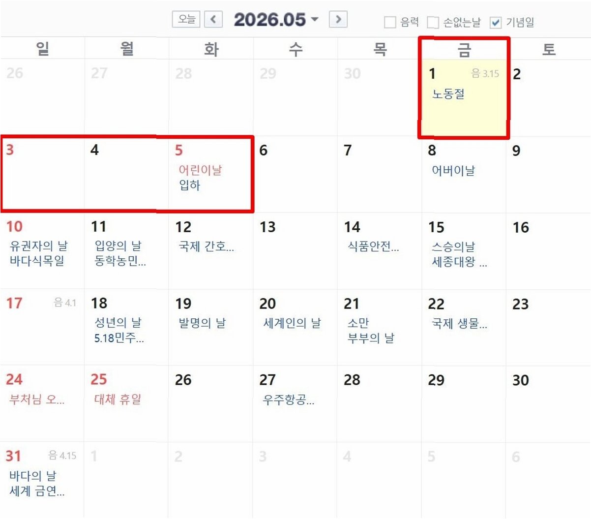 A.일요일, 1월 1일, 설날, 추석, 5대 국경일, 어린이날, 현충일, 성탄절, 부처님오신날, 대체공휴일 등이 있습니다.
