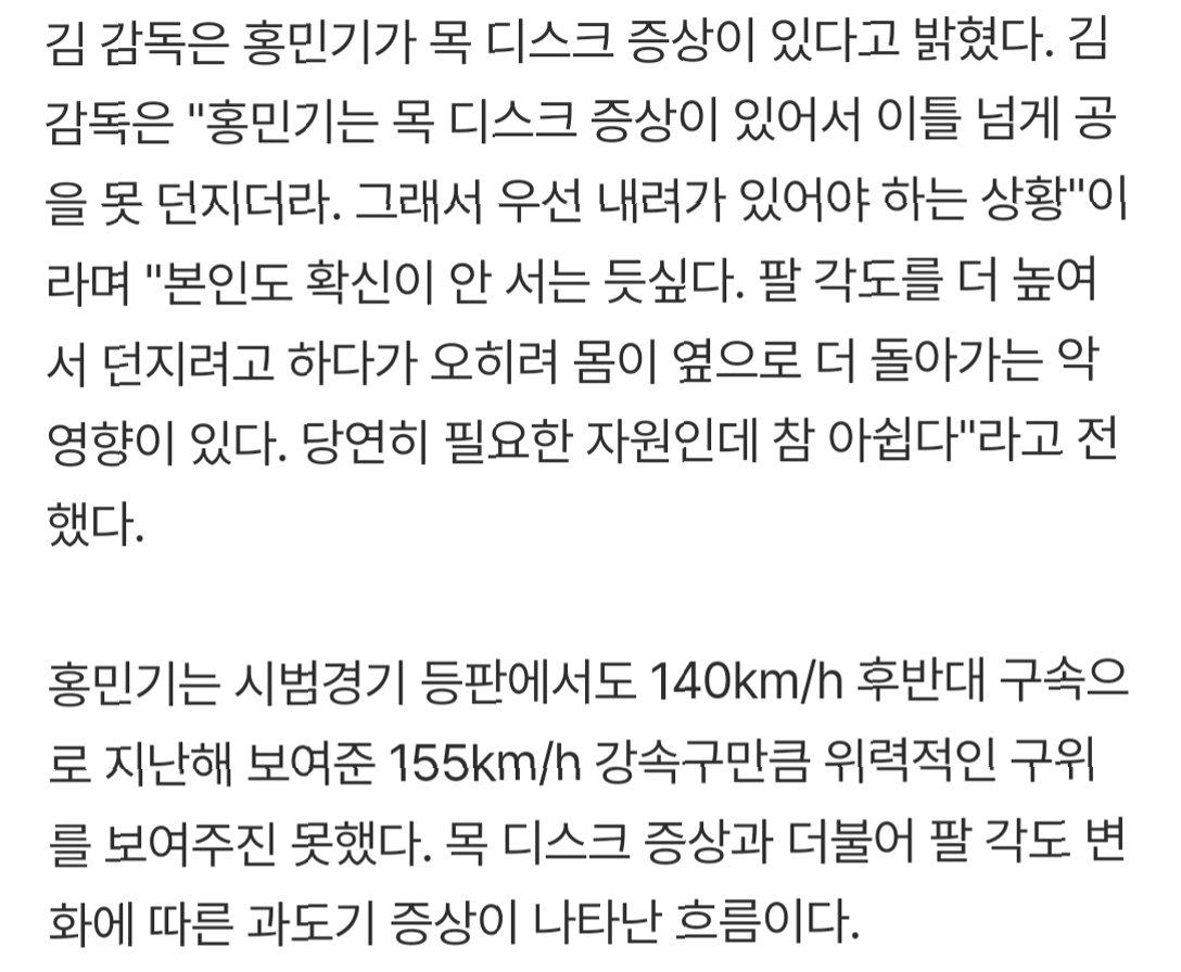 김태형 감독은 홍민기가 목 디스크 증상을 겪고 있다고 밝혔습니다. 감독은 "홍민기는 목 디스크 증상이 있어서 이틀 넘게 공을 못 던지더라. 그래서 우선 내려가 있어야 하는 상황"이라며, "본인도 확신이 안 서는 듯싶다. 팔 각도를 더 높여서 던지려고 하다가 오히려 몸이 옆으로 더 돌아가는 악영향이 있다. 당연히 필요한 자원인데 참 아쉽다"라고 전했습니다. 이러한 증상은 그의 투구에 직접적인 영향을 미치고 있습니다.