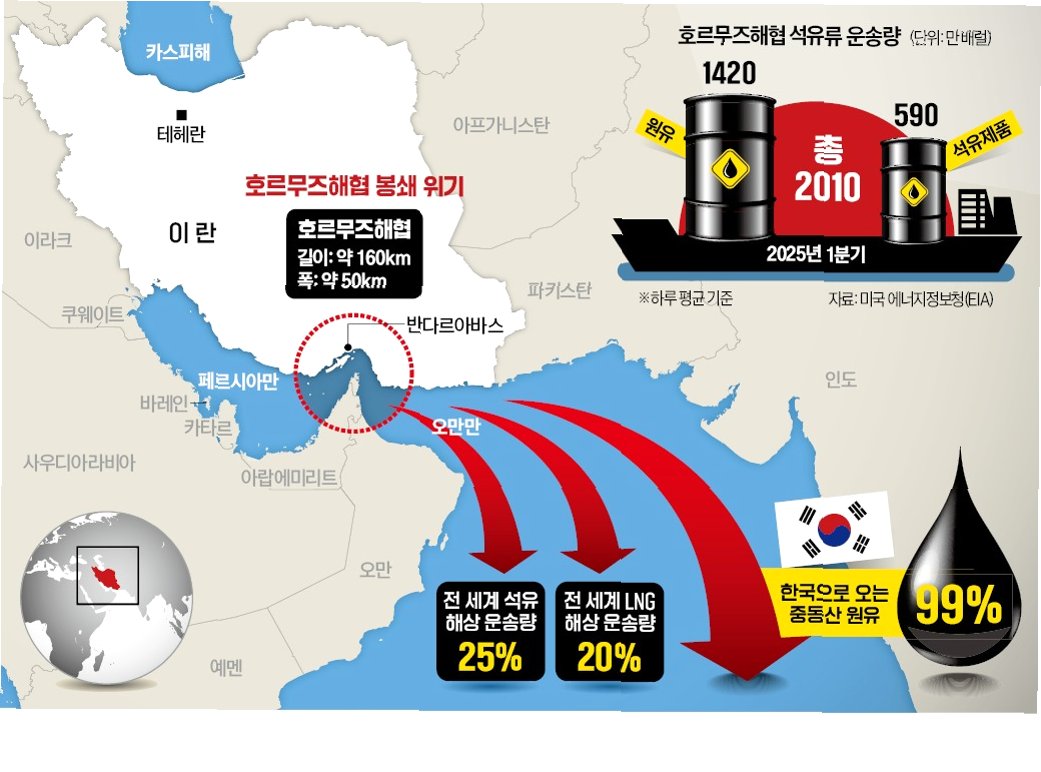 A.호르무즈 해협은 전 세계 원유 수송량의 상당 부분이 통과하는 지정학적으로 매우 중요한 해상 통로입니다. 이곳의 봉쇄는 국제 유가 급등과 에너지 공급망 불안정을 야기하여 세계 경제에 큰 영향을 미칩니다.
