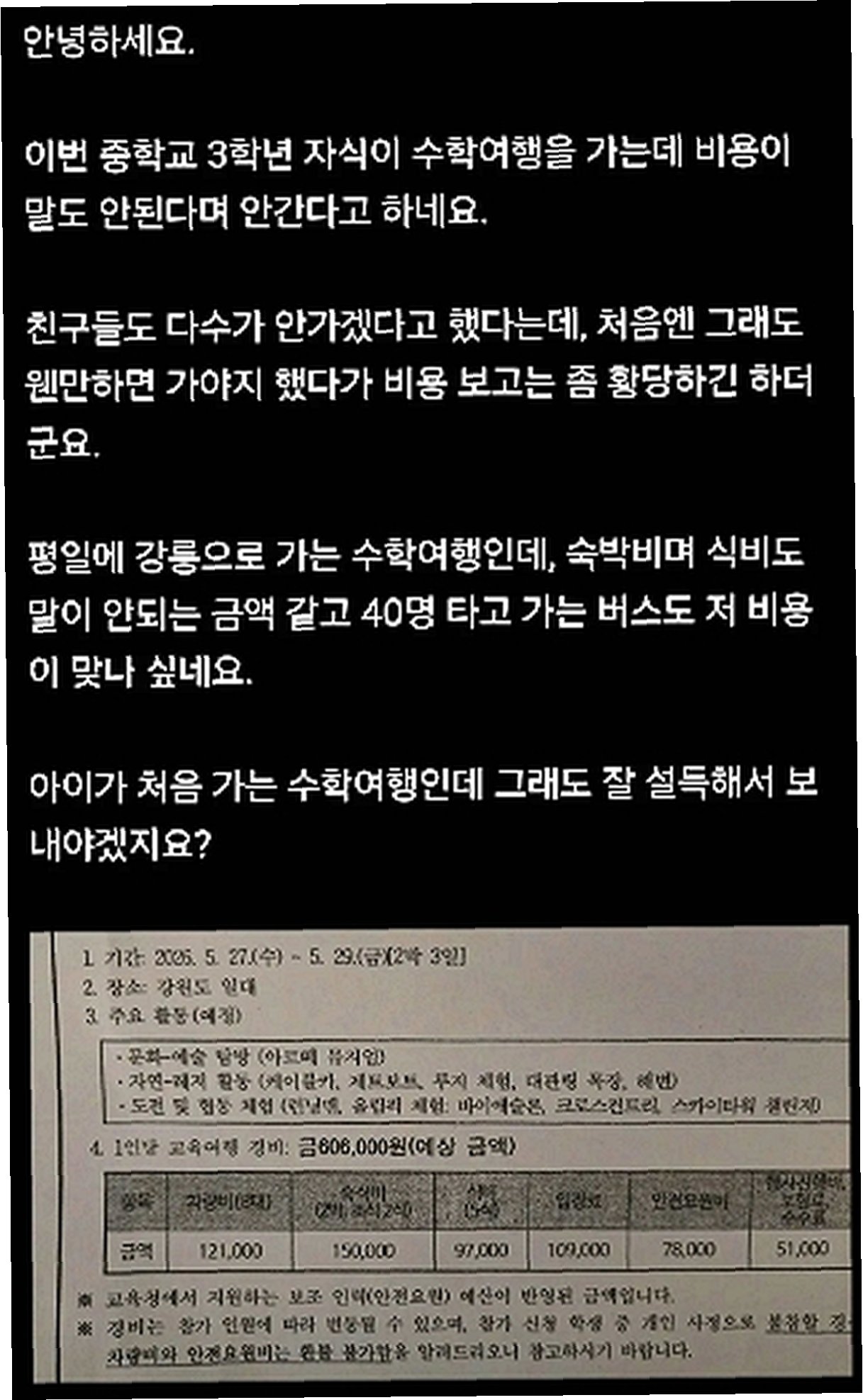 최근 강원 강릉으로 떠나는 2박 3일 수학여행 비용이 1인당 60만 6000원에 달한다는 소식이 전해지며 학부모들의 부담과 논란이 커지고 있습니다. 차량비, 숙박비, 식비, 체험 활동비, 안전 요원비, 운영비 등이 포함된 이 금액에 대해 '국내 여행치고는 과도하다'는 비판과 '세부 내역을 보면 이해된다'는 의견이 분분합니다. 이러한 논란 속에서 현직 교사가 직접 나서 수학여행 비용 구조와 현장 상황을 설명하며 입장을 밝혔습니다.