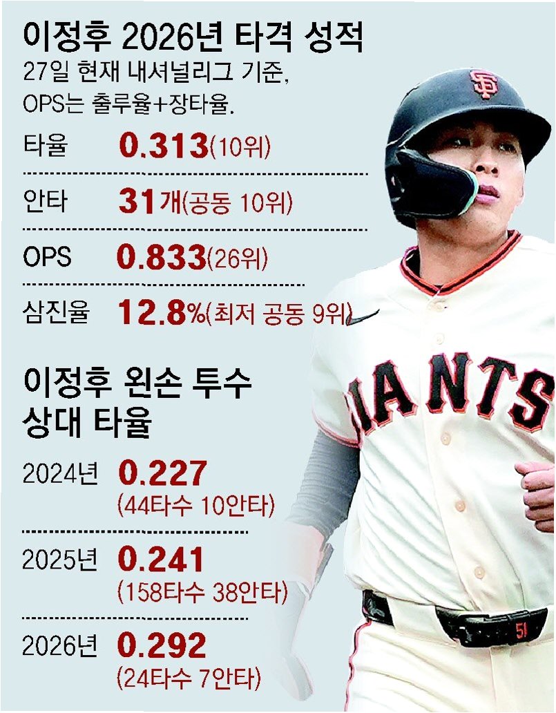 이정후 선수가 1990억 원의 가치를 지닌 필라델피아의 좌완 투수 헤수스 루자르도를 상대로 4타수 무안타를 기록하며 최근 3경기 연속 안타 행진을 마감했습니다. 시즌 타율은 .301로 하락하며 3할대 방어선이 위태로워졌습니다. 루자르도는 7이닝 무실점 호투로 시즌 2승을 거두었고, 필라델피아는 감독 경질 후 첫 승을 신고했습니다.