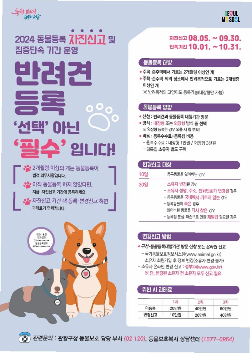 반려동물, 가족의 일원이 되다2024년, 반려동물을 키우는 국내 가구 비율이 28.6%에 달하며, 2010년 17.4%에서 연평균 3.6%씩 꾸준히 증가하고 있습니다. 사랑스러운 댕댕이, 냥이들과 함께하는 행복한 일상, 이제는 더욱 책임감 있는 자세로 함께해야 합니다. 동물등록제, 왜 필요한가?정부는 유기견, 유기묘 발생을 줄이고, 반려동물 소유주의 책임을 강화하기 위해 동물등록제를 시행하고 있습니다. 2014년부터는 월령 2개월 이상의 반려견을 대상으로, 2018년부터는 반려묘를 대상으로 시범사업이 진행되고 있습니다. 동물등록은 단순히 법적 의무를 넘어, 우리 아이들의 안전을 지키는 첫걸음입니다. 동물등록, 어떻게 하나요?동물등록은 동물등록 대행기관(동물병원 등)을 방문하여 진행할 수 있습니..