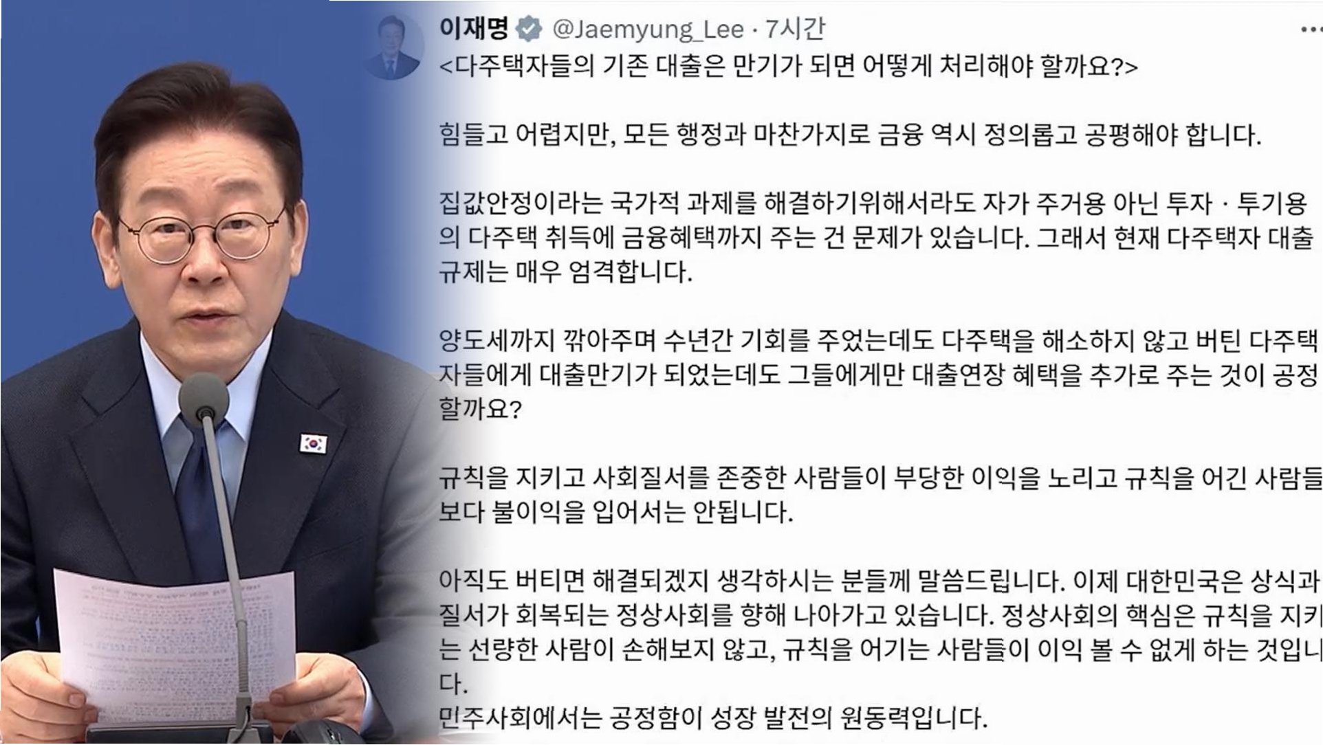 대통령, 다주택자 규제 반대하는 국민의힘에 직격탄이재명 대통령이 제1야당 국민의힘을 향해 “다주택자를 규제하면 안 되고, 이들을 보호하며 기존의 금융 세제 등 특혜를 유지해야 한다고 보십니까”라고 직설적인 질문을 던졌습니다. 이는 부동산 시장 정상화를 강조하는 이 대통령을 향해 국민의힘이 다주택자 협박 발언이라며 공세를 펼치자, 이에 대한 반격으로 풀이됩니다. 대통령이 직접 국민의힘을 언급하며 다주택자 특혜 회수에 반대하는지 묻는 것은 이번이 처음입니다. 이 대통령은 특히 장동혁 국민의힘 대표에게 직접적으로 질문하며, 다주택자 문제에 대한 정치권의 입장을 분명히 하도록 압박했습니다. 집은 주거수단, 투기 수단으로 인식되는 현실 비판이 대통령은 새벽 엑스(옛 트위터)에 관련 기사를 공유하며 “집은 투..